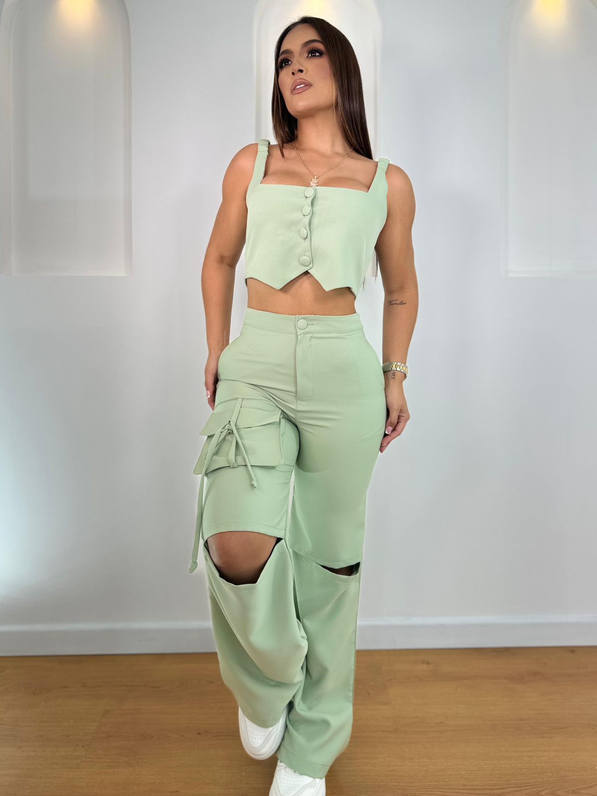 - *Pantalón Largo:* El pantalón largo del Set Luciana presenta un corte elegante y contemporáneo, con un detalle roto a la altura de las rodillas que añade un toque de audacia y frescura. Este diseño no solo es atractivo, sino que también permite una mayor libertad de movimiento, ideal para cualquier ocasión.